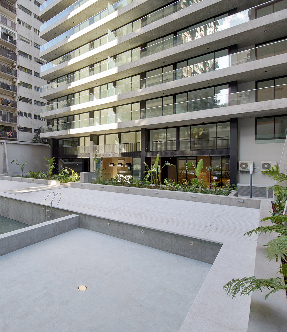 Sucesión de placas horizontales suspendidas de hormigón, conforma un volumen de extrema simpleza que se inserta en un entorno algo caótico. El edificio emerge geométrico en su rígida propuesta formal y se eleva sobre los árboles de altura considerable, estableciendo un diálogo de opuestos.